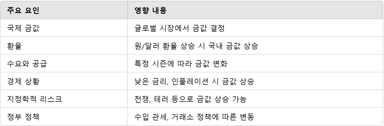 - 금 수입 관세, 거래소 정책 등이 국내 금값에 영향을 미침.